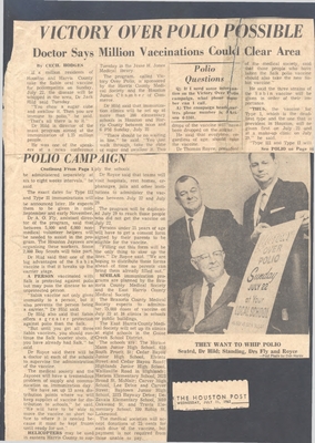 Vaccination, Poliomyelitis, Inactivated Poliovirus Vaccine, Teaching, Houston (Tex.), Harris County (Tex.), Houston Chronicle, Texas Institute for Rehabilitation and Research, Hermann Hospital (Houston, Tex.), Rice University (Houston (Tex.), Harris County (Tex.), newspaper clippings, news photographs